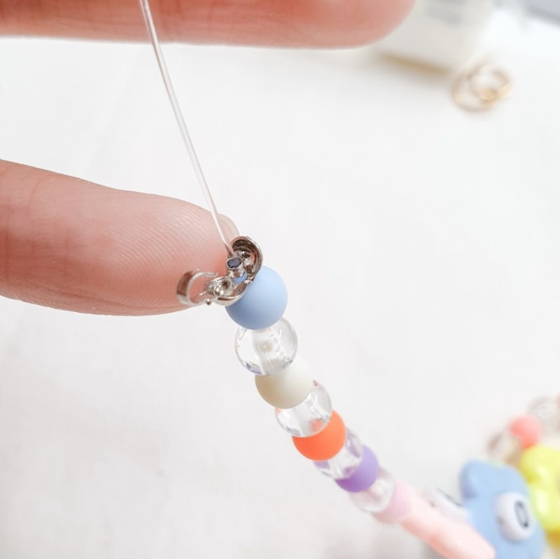 시작할 때 우레탄 끈에 올챙이 캡을 씌우고 구슬을 끼우면 반대쪽으로 흐르지 않습니다. 마무리 방법은 올챙이 캡을 끼워 고정공을 끼웁니다.고정볼을 집게로 잡으면 끈이 고정됩니다. 저는 좀 더 튼튼하게 하기 위해 끈을 고정볼에 돌려서 다시 통과시켜 주었습니다.