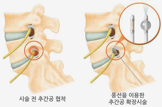 풍선확장술은 척추의 퇴행성 변화로 좁아진 척수신경통로(척수관과 추간공)에 미골을 통해 풍선확장 기능이 있는 특수 카테터를 삽입한 뒤 풍선확장과 이완을 반복해 협착증을 완화하는 방법이다. 신경유착으로 인해 신경치료제나 주사로는 도달하기 어려운 좁아진 신경통로(척수관 및 추간공)를 열어 신경치료제가 병변에 도달할 수 있도록 하여 치료효과가 협소함을 볼 수 있도록 하는 풍선수술 . 확장치료를 통해 신경주변의 부종, 염증, 유착 등을 해결하여 협착증의 증상을 개선하여 협착증으로 인한 좁은 신경공간에서도 척수신경이 잘 적응하고 변형되도록 하는 비수술적 척추치료입니다.