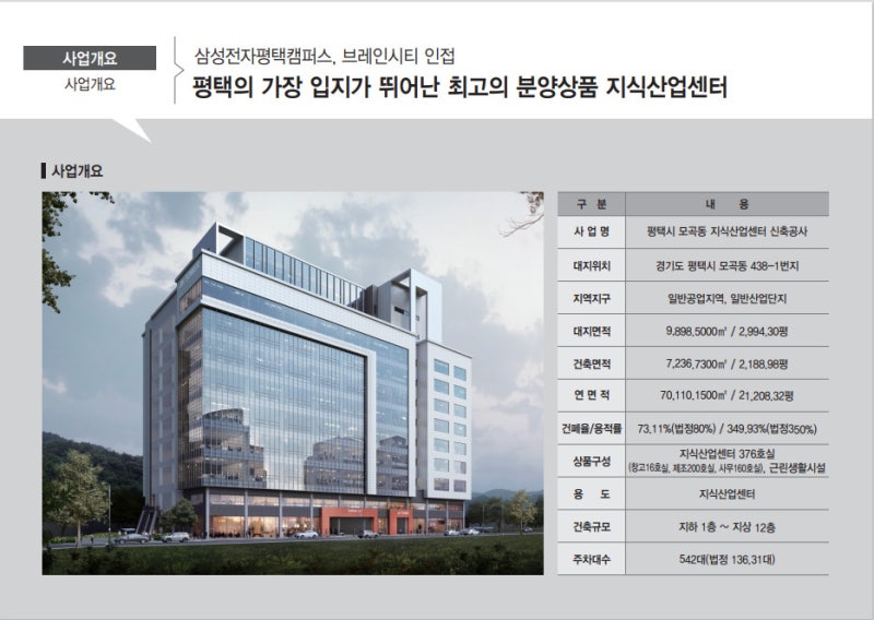 대기업 수요층에 임대가 가능하기 때문에 보다 안정적이고 장기적인 수익을 창출할 수 있는 상품입니다. 사업장은 평택시 모곡동 438-1번지에 위치하고 있으며 지상 1층부터 지상 12층까지 설계되는 지식산업센터는 367실의 객실과 근린생활시설을 갖춘 복합상업시설이 될 예정이다.